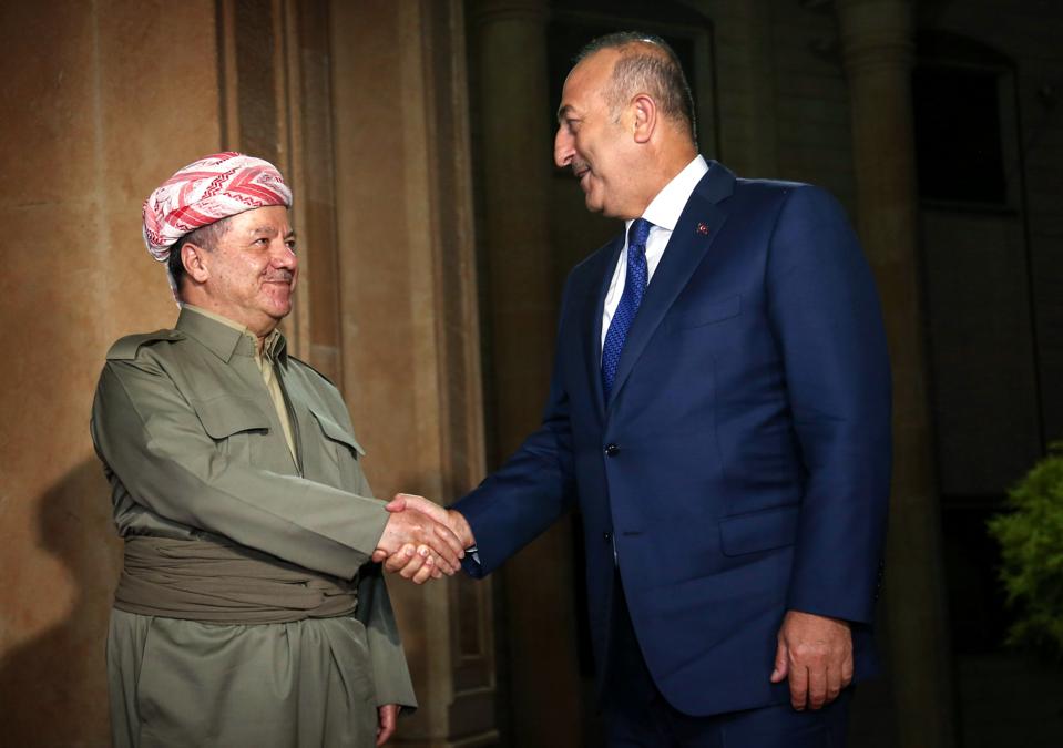 | Iraq's Kurdistan region president Massed Barzani (L) shakes hands with Turkish Foreign Minister Mevlut Cavusoglu on in Erbil, the capital of the Kurdish autonomous region in northern Iraq. (AFIN HAMED/AFP/Getty Images) |
